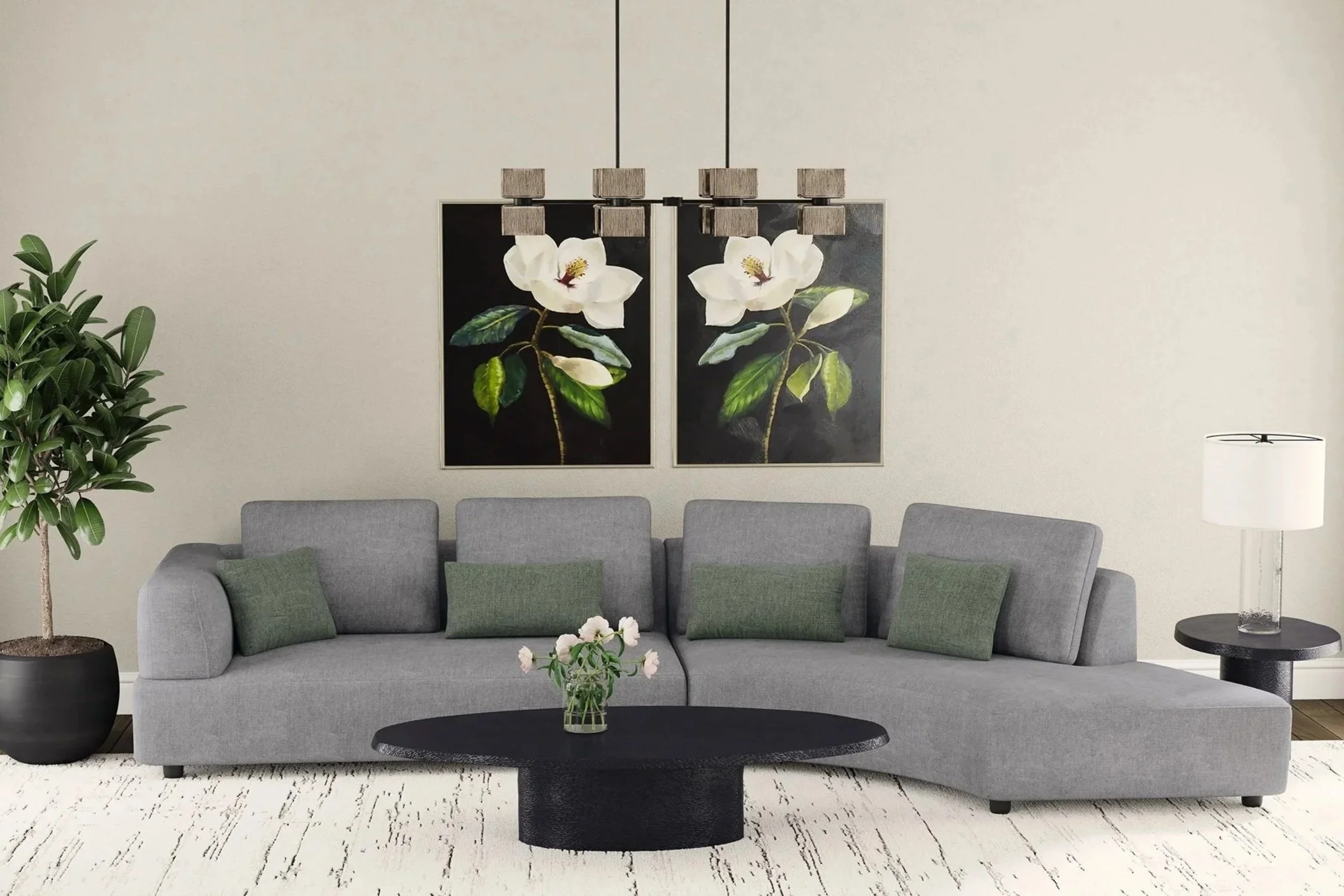 Modern living room with beige sofa, two beige armchairs, abstract painting, round coffee table, side tables with lamps, geometric rug, wooden floor.
